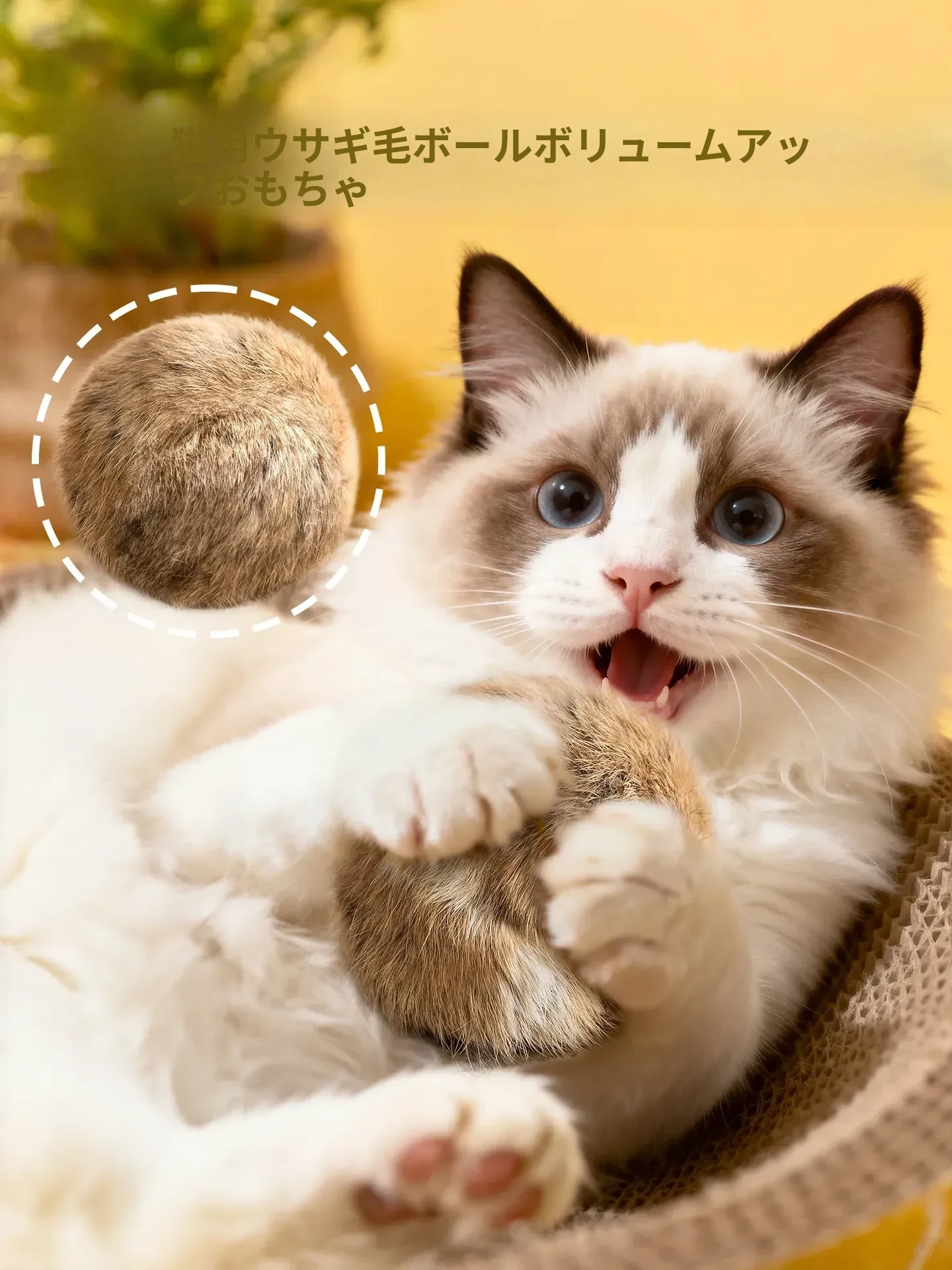 天然ウサギ毛使用!猫ちゃんが夢中になるおもちゃ、静音で噛めるふわふわボール。退屈知らずの楽しい時間を提供する、最高の猫のお友達!