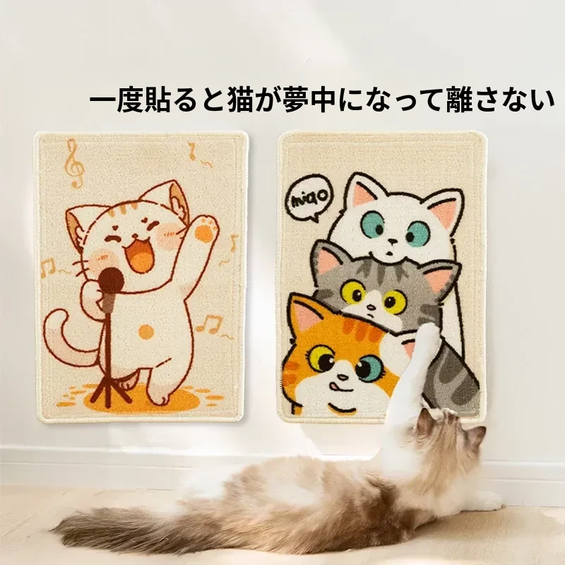 猫ちゃんのためのかわいいキャラクター粘着マット!穴あけ不要で壁に簡単に取り付けられる、爪研ぎ&遊びに最適なふわふわキャットパッド。ペットのストレス解消にもぴったり!